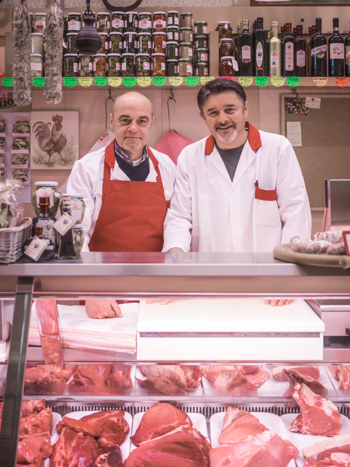 Ercole Garlaschè è nato a Vigevano ed il padre era allevatore. Ha iniziato a fare il macellaio a 14 anni. Man mano è cresciuto ed è diventato il macellaio di quartiere. Anche lui, come Mario ha rilevato l’attività già avviata. La sua macelleria ha 60 anni di attività, anche se lui ci sta dentro da meno della metà. Ma vedere i suoi banchi è bellissimo. Ordinati, cromaticamente coerenti e c’è un invitante gioco di tagli e composizioni.