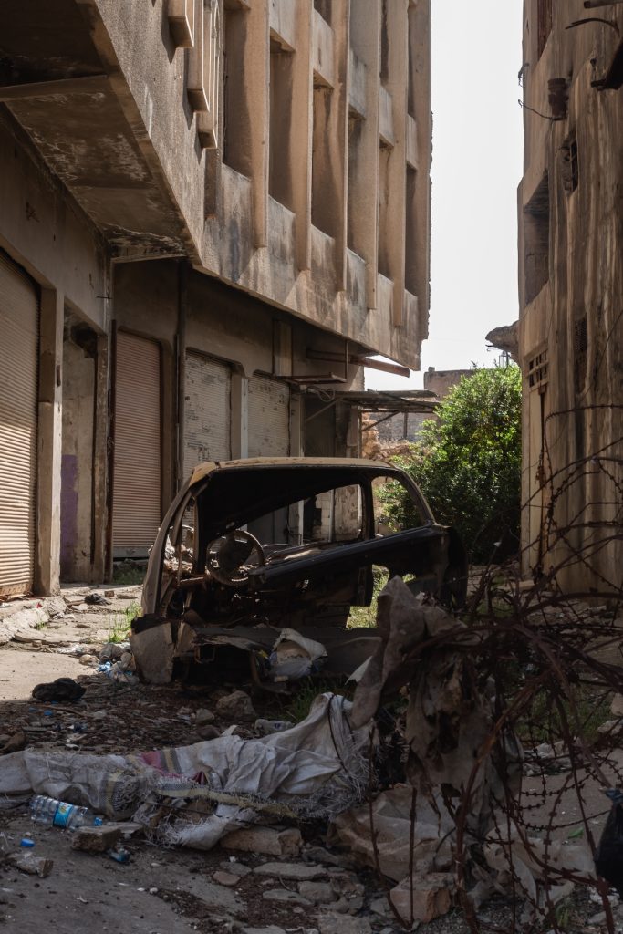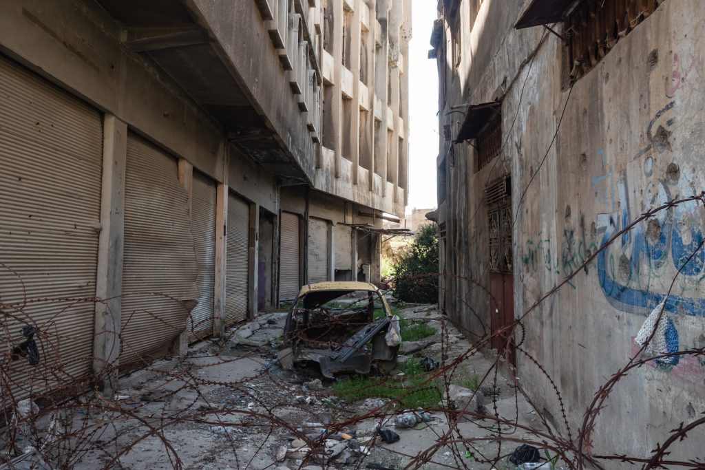 Passaggio stretto tra edifici distrutti dai bombardamenti.