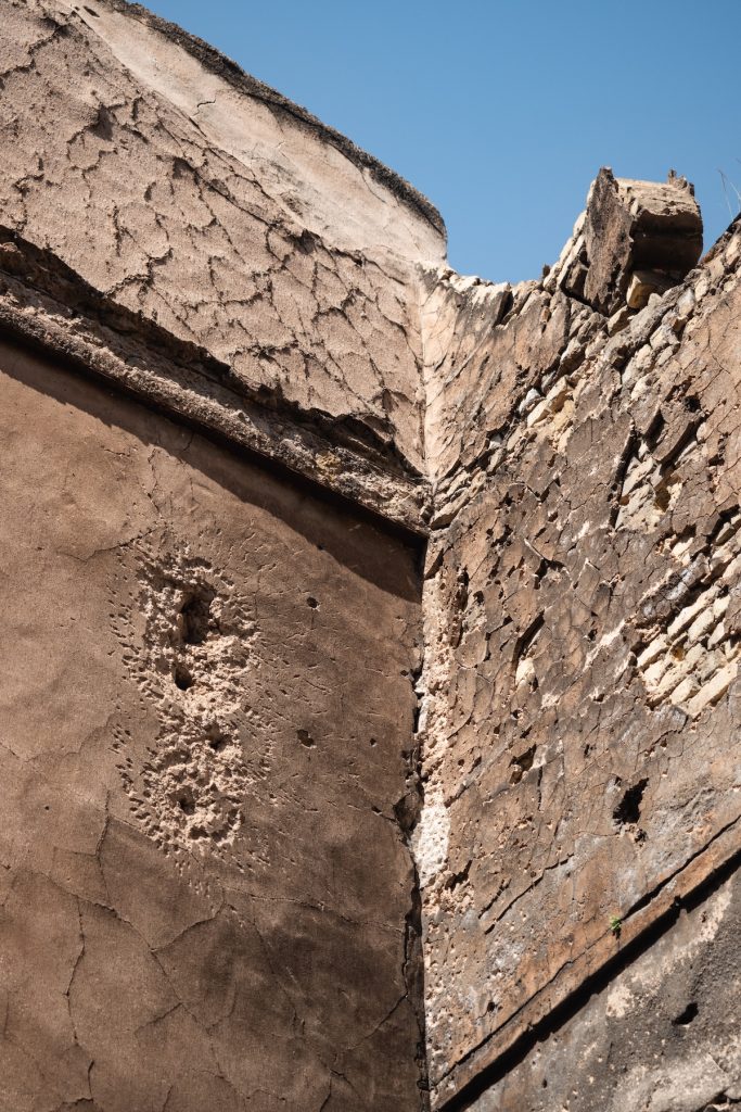 Facciate crivellate di colpi in un quartiere antico.