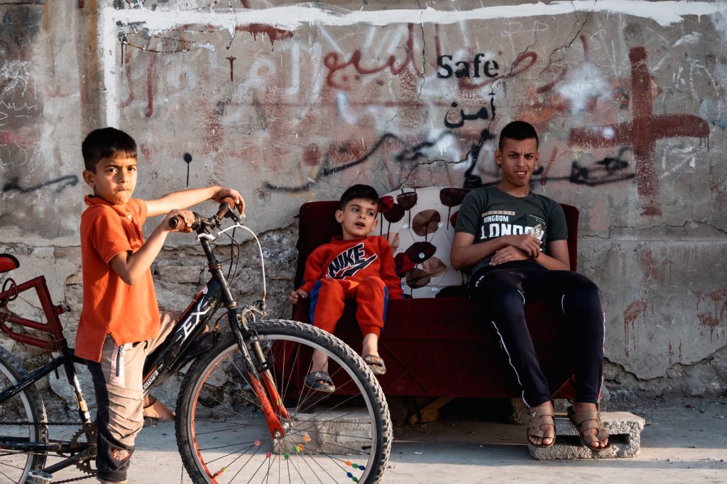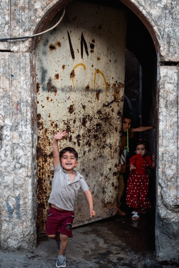 Bambini che giocano in un vicolo segnato dalle tracce della guerra.